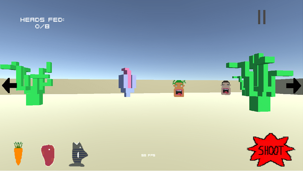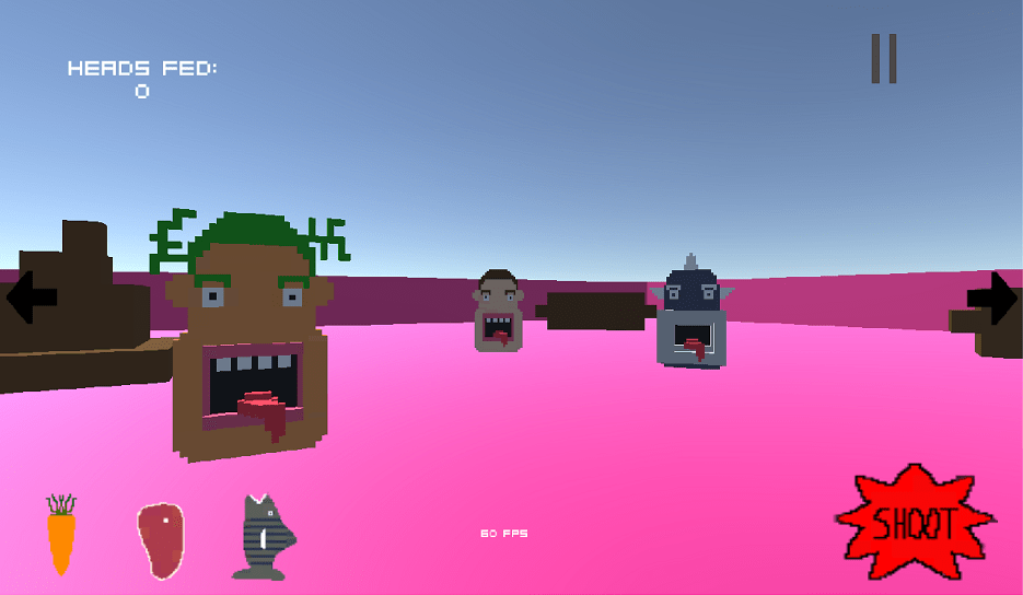 The aim of the game is to feed the heads with the corresponding heads before they consume the player. The levels progress in difficulty, resulting in a final level which consists of an endless wave shooter.